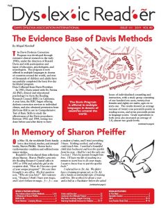 This issue includes an overview of the research evidence supporting Davis methods, and a tribute to the Sharon Pfeiffer, the creator of the Davis Learning Strategies school program, who passed away in May 2019.